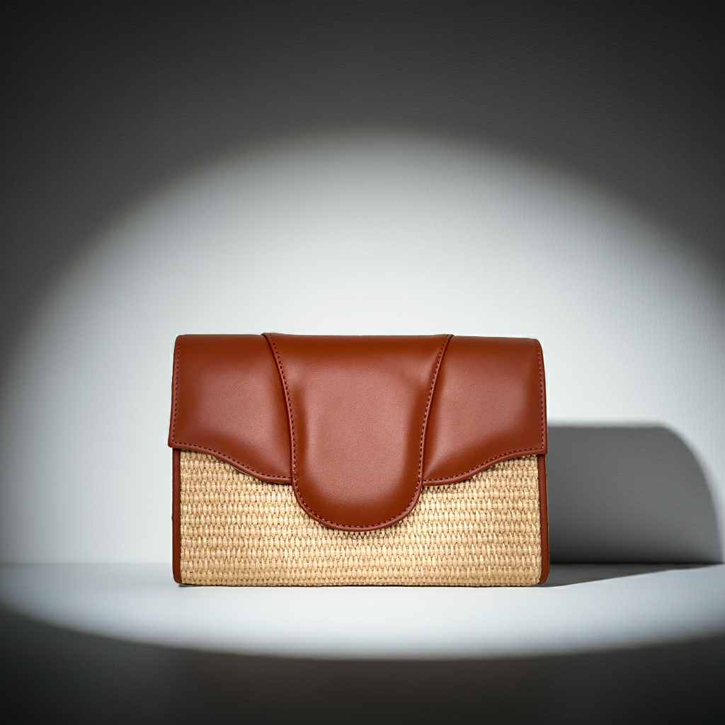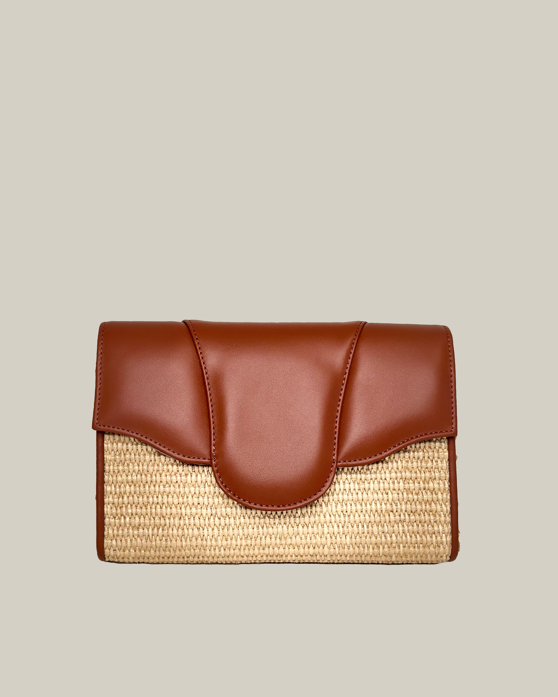 Less than 2 created worldwide. Inspired by the palmyra tree this handcrafted raffia clutch with its smooth and luxurious Italian Nappa leather flap. Signature curves accent the shape of this beautiful clutch with a detachable 100% brass crossbody chain.